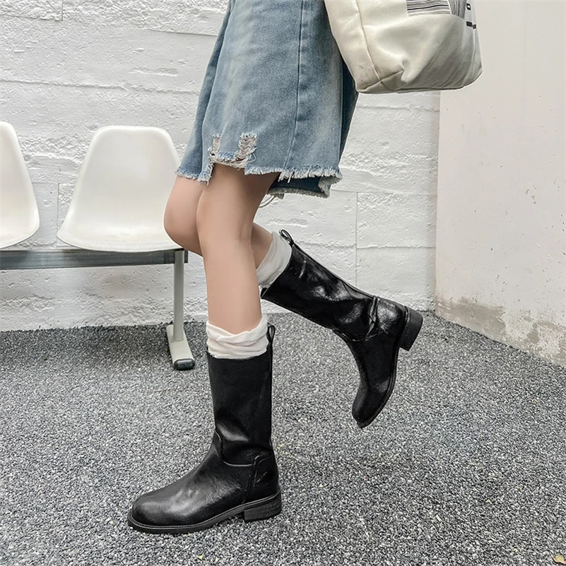 The Amelia Women's Mid Calf Boots from Footens Shoes are made from top-quality genuine cow leather. comfortable and breathable sheepskin insole. and TPR outsole. The elegant design features a mid-calf height. sewing details. and a square heel for superior support and style. These boots are designed for a true-to-size fit. and feature a slip-on closure for easy wear.