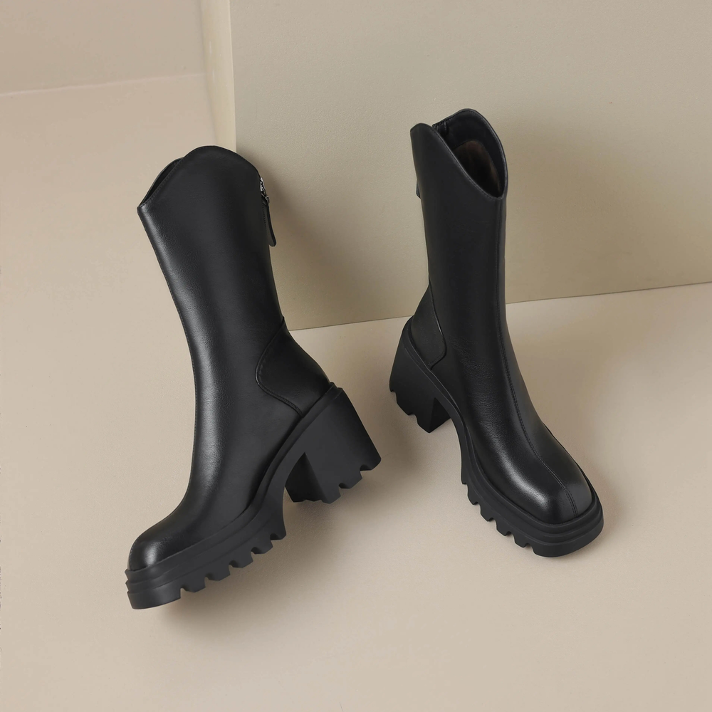 For a stylish retro look. the Bruna Women's Mid Calf Boots by Footens Shoes offer a classic silhouette crafted with genuine cow leather upper. round toe shape. and square heel type. The short plush lining and insole make them warm and comfortable in cold winter and autumn months. A subtle yet stylish ROME detail adds to the vintage design. The sturdy rubber outsole ensures durability and traction. Available in black and brown.