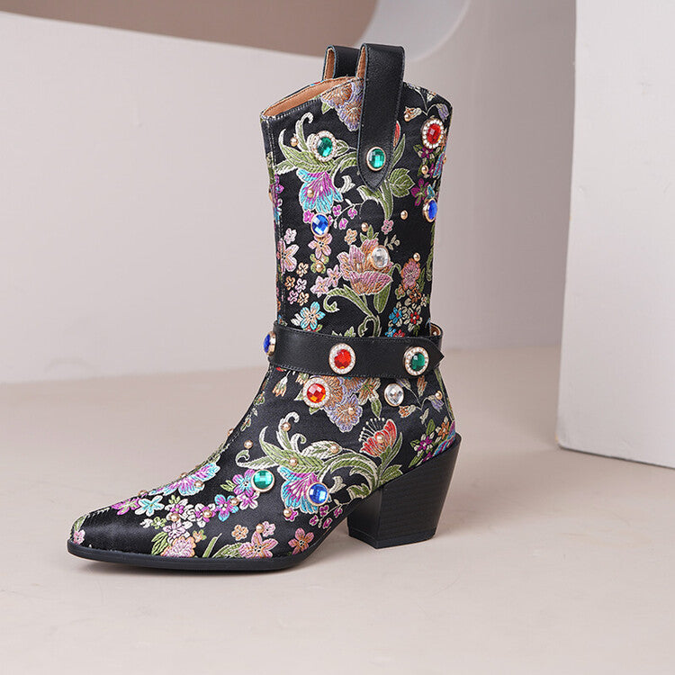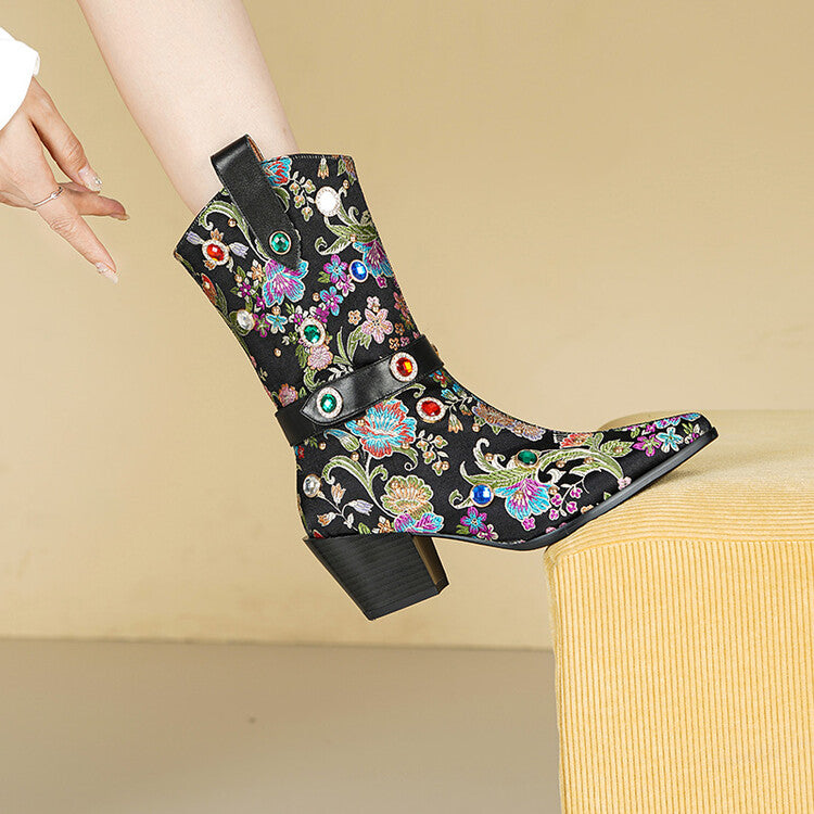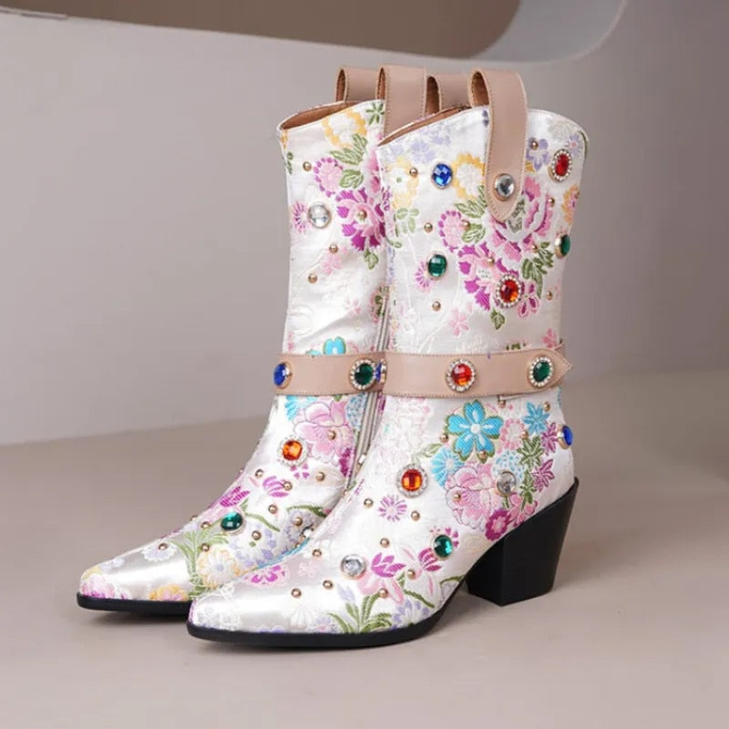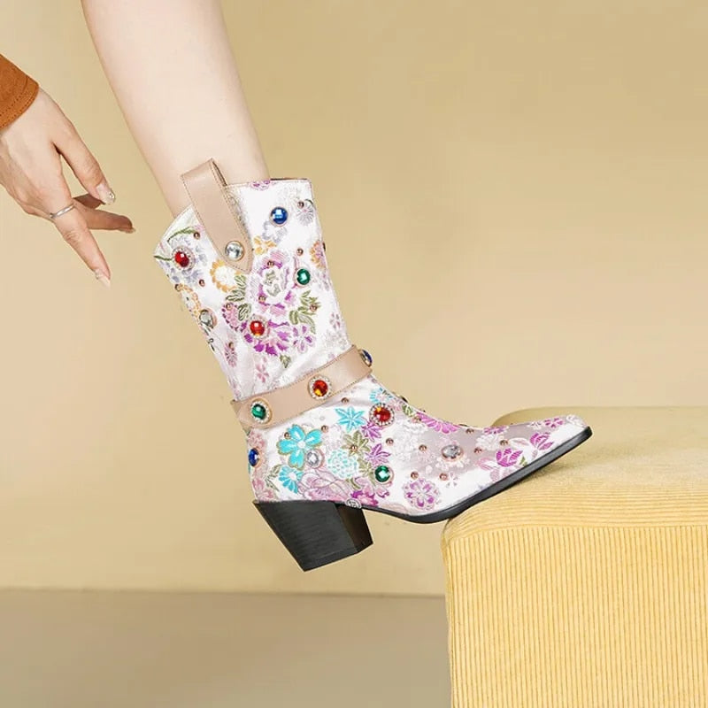 Clariza Women's Boots from Footens Shoes have a luxurious design. The embroidered details give it extra style and glamour. crafted with genuine leather and a TPR outsole for durable wear. A striking pointed toe. square heel. zip closure. and ankle boot height complete the look for a fashionable and comfortable fit. Crafted to fit true to size.