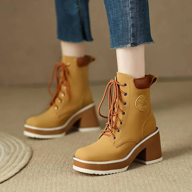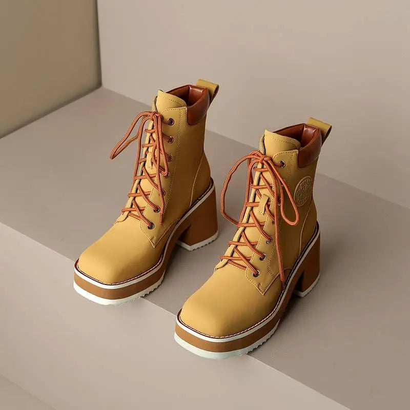 These Women's Cleo Platform Boots from Footens Shoes provide a stylish and comfortable fit. Genuine cow leather uppers. a square toe design. 3-inch square heels. and a lace-up closure make them unique in style and comfort. The interior of the boots is lined with soft. short plush and is equipped with a plush insole for added cushioning. The sturdy rubber soles make them ideal for winter. fall. and spring.