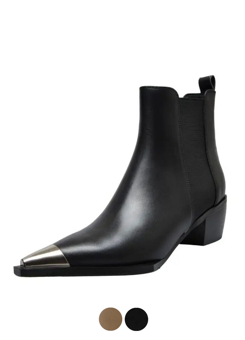 Stay stylish and comfortable in the Ferrez Women's Metal Ladies Pointed Toe Ankle Boots from Footens Shoes. Crafted with genuine cow leather and a synthetic lining. these elegant boots feature a square heel and a pointed toe for an upscale look. With metal decoration and a slip-on closure. these ankle boots provide the perfect fit. season after season. Get high-quality fashion boots from Footens Shoes.