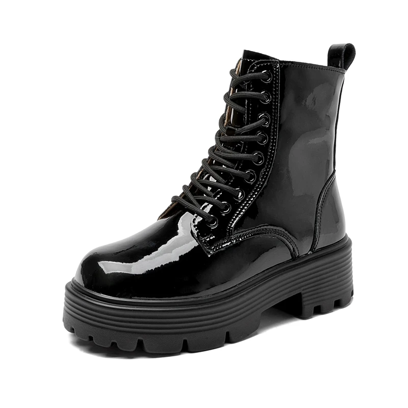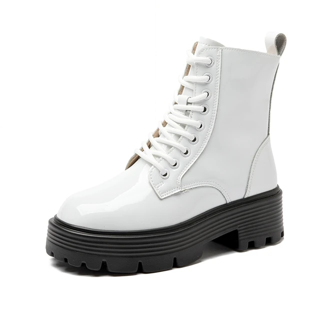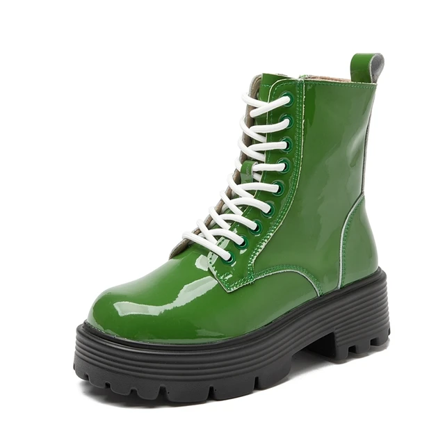 The Frager Women's Leather Patent Boots from Footens Shoes feature a combination of split leather upper and shaft material. plus a polyurethane outsole for long-lasting wear. Lined with plush for extra warmth and comfort. they have a classic square heel. round toe. and lace-up design. Available in black. white. green. or red. they deliver style and support in any season.