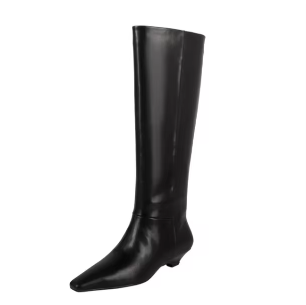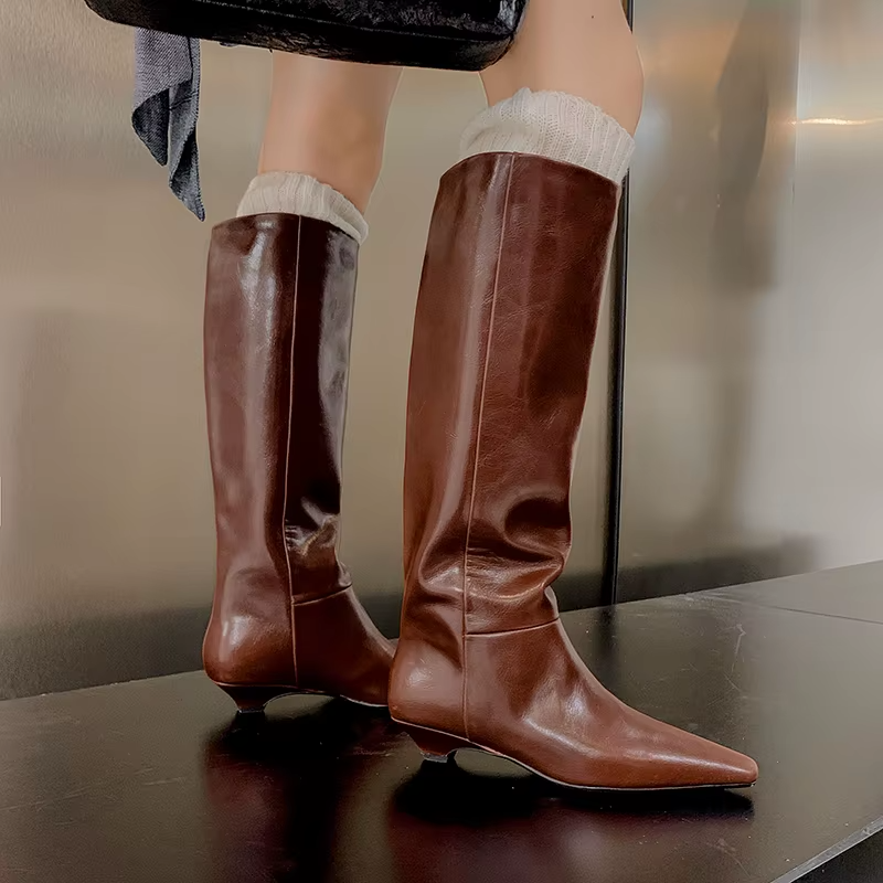 The Karla Women's Leather Boots by Footens Shoes are a must-have for any luxury wardrobe. Crafted from genuine leather. these knee-high boots feature an elegant square toe and a slip-on closure. The soft sheepskin insole and pigskin lining provide comfort and the 1.18" kitten heel adds a touch of sophistication. Available in a timeless black-brown color. these boots are perfect for the spring and autumn seasons. Elevate your style with Footens Shoes.