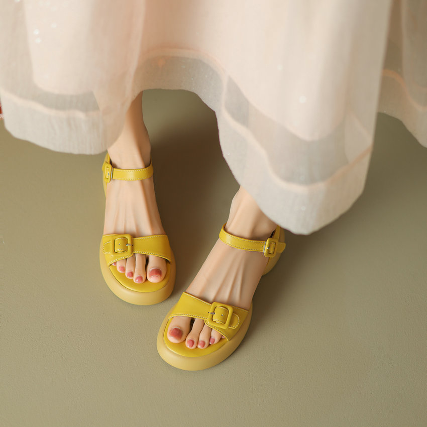 The Livia Women's Summer Flat Sandals by Footens Shoes offer a comfortable and stylish footwear choice for the warmer seasons. Made with high-quality materials such as polyurethane and microfiber. these ankle-wrap sandals feature a sturdy rubber outsole and a secure buckle strap closure. The open-side vamp design and platform fashion element add a touch of elegance to these sandals. With a square heel measuring 1.5". they provide both style and comfort for any occasion.