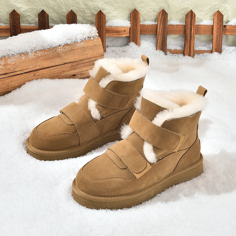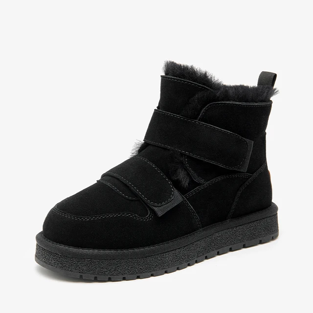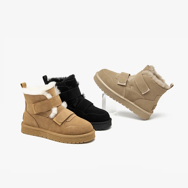 Explore the outdoors with the Loreana women's hook & loop winter boots from Footens Shoes. Designed for snowy conditions. these snow boots feature a cow suede upper for durability and warmth. The TPR outsole provides traction on slippery surfaces. while the artificial fluff lining keeps your feet cozy. Available in black. apricot. and camel.