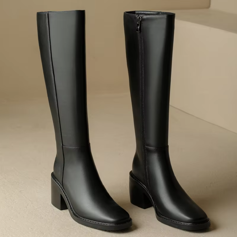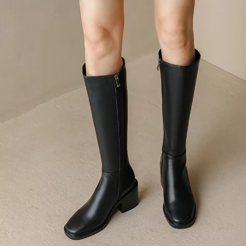 Crafted with a split leather shaft. rubber outsole. and genuine leather upper. the Footens Shoes Malena Women's Leather Tall High Boots are perfect for winter and autumn. The plush insole and short plush lining provide warmth and comfort. while the square heel and square toe add a touch of fashion. With a knee-high length and zip closure. these boots offer a perfect fit.