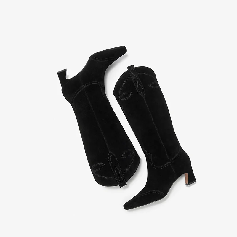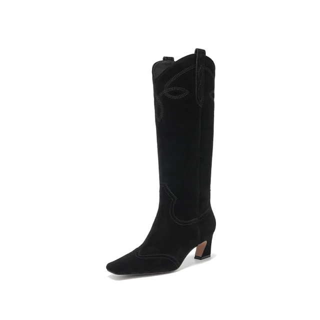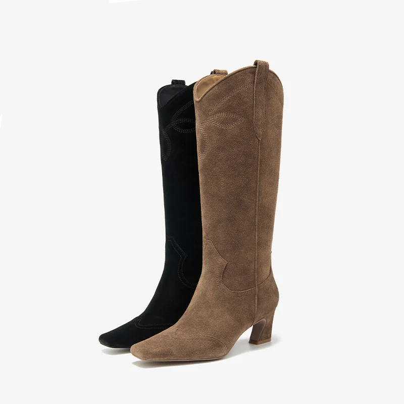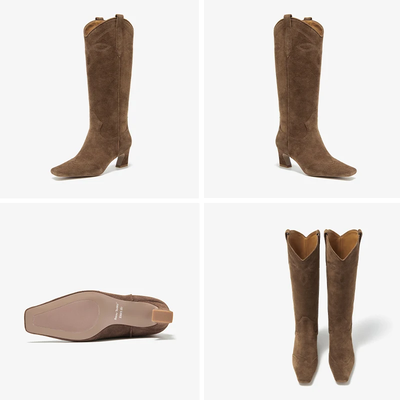 These Malli Women's Long Leather Boots from Footens Shoes are crafted from a combination of genuine cow leather for the shaft. upper. and lining. and an outsole and insole made of durable rubber. Available in two colors. coffee. and black. these boots offer a square toe. a knee-high design. and a height-increasing heel. They fit true to size. making them perfect for the winter or autumn months.