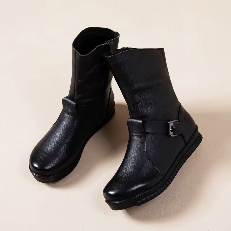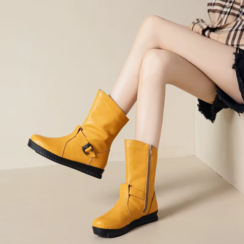 Crafted for the modern woman. the Footens Shoes Minerva Women's Flat Leather Boots provide ultimate comfort and style. Made with genuine leather and a plush lining. these mid-calf boots are perfect for any season. The rubber outsole offers durability and the buckle detail adds a touch of fashion. Zip up and step out in confidence.