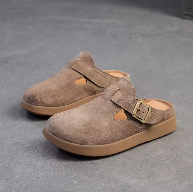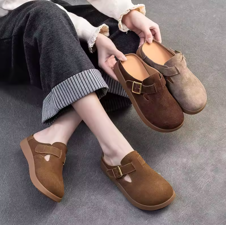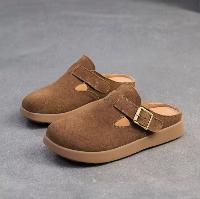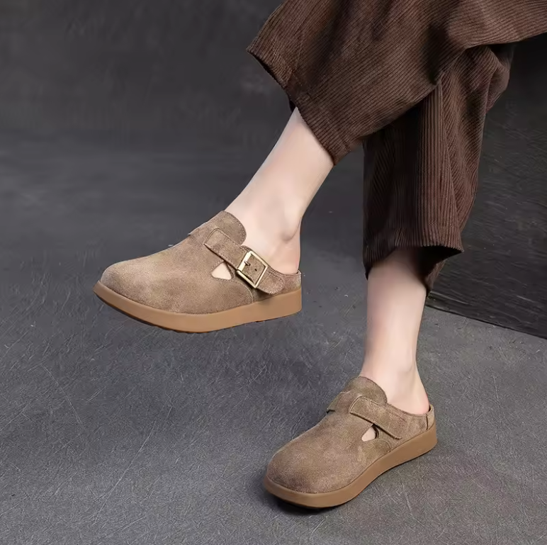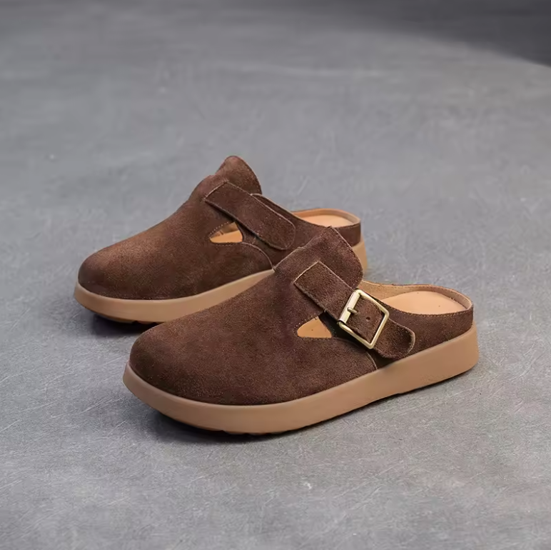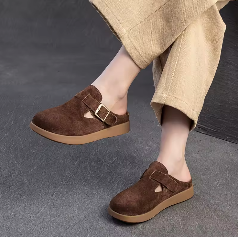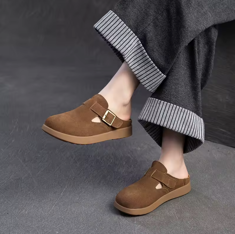 Step into quirky comfort and eco-friendliness with the Nela Leather Slippers by Footens Shoes. Crafted with genuine leather. pigskin insoles. and a rubber outsole. these mules feature a playful buckle detail and slip-on design for easy wear. Perfect for outdoor adventures. these slipper are made to order. minimizing waste and maximizing your style.