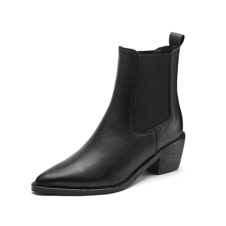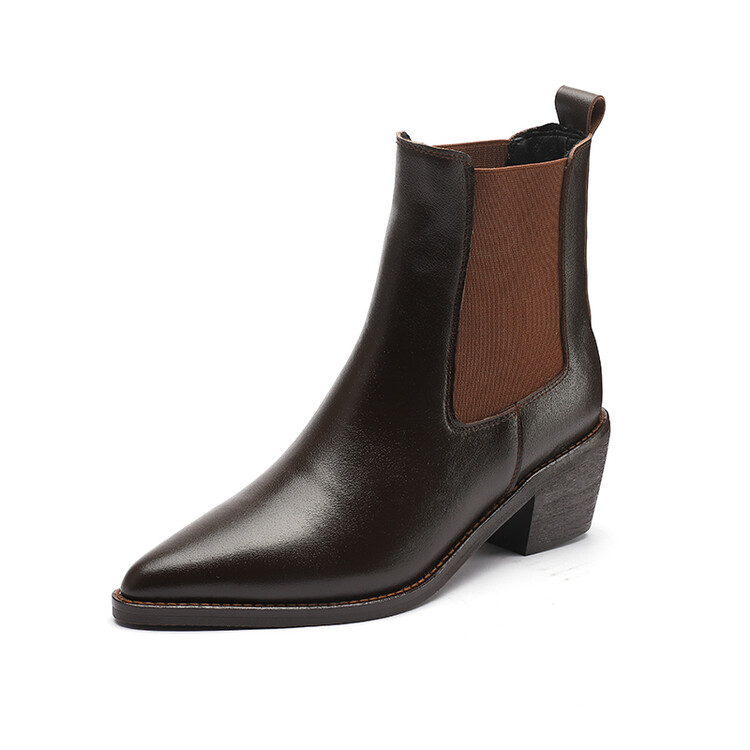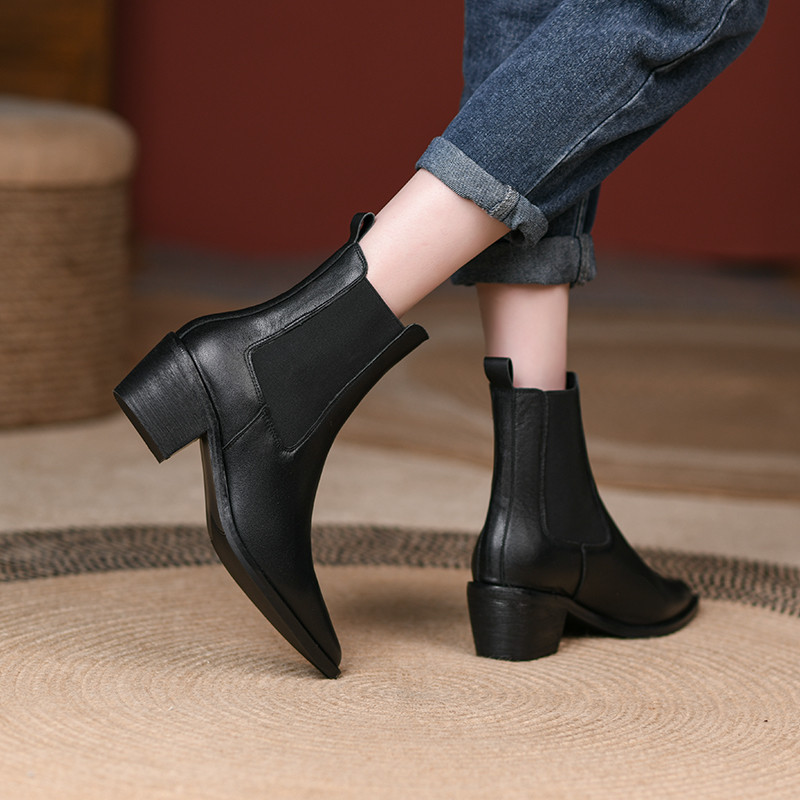 Expertly crafted with genuine cow leather. these Olga Women's Chelsea Boots by Footens Shoes are perfect for the winter and autumn seasons. The pointed toe and square heel add a fashionable touch. while the velvet insole and lining provide extra comfort. The slip-on design and splicing detail make these boots both stylish and easy to wear. With a 2-inch heel. these boots fit true to size for a flattering fit. Buy your high-quality boots at Footens Shoes.