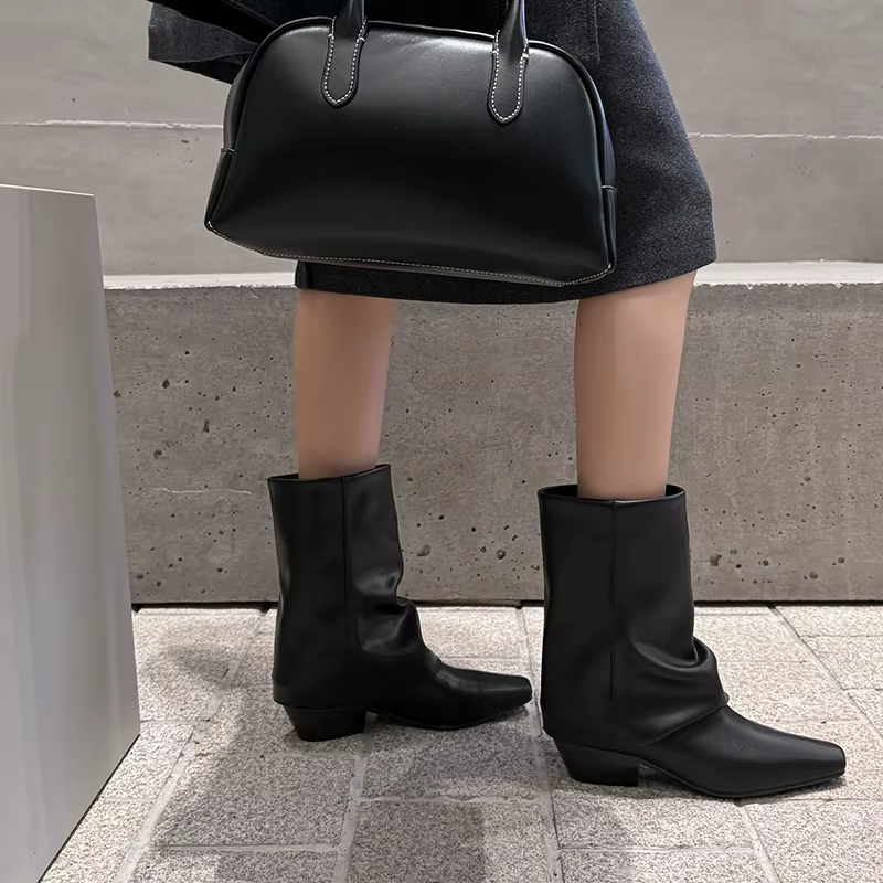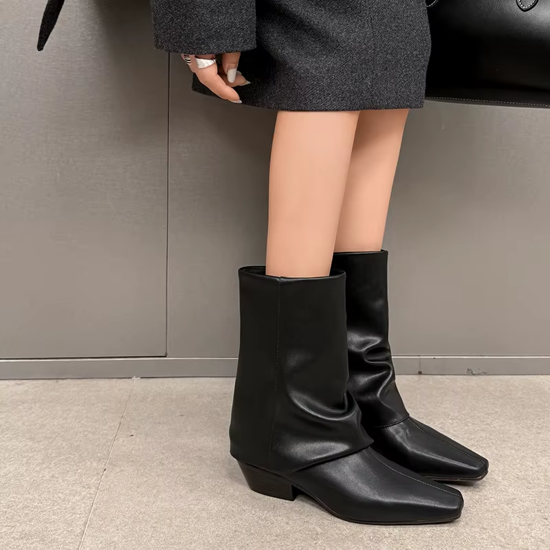 Elevate your winter fashion with the Footens Shoes Oriana Cowboy Square Toe Boots. Made of genuine cow leather. these mid-calf boots feature a slip-on closure. short plush insole. and spike heels for a comfortable and stylish fit. The rubber outsole provides durability. making these the perfect addition to your wardrobe this season.