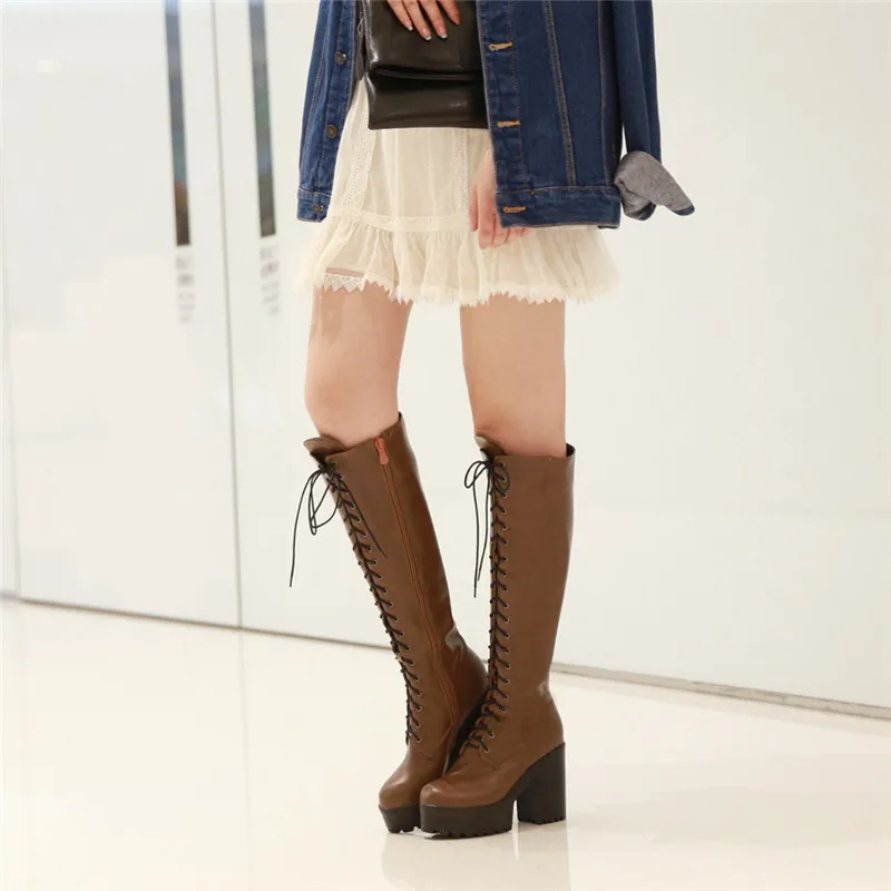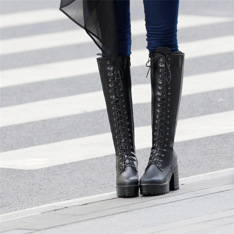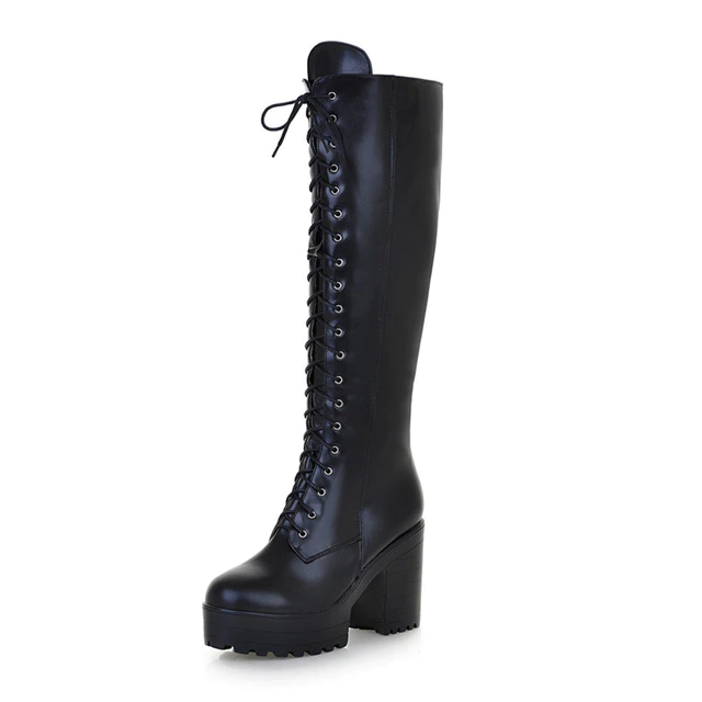 Be bold and stylish this season with Footens Shoes Perla Women's Lace-Up Platform Boots. Made with durable and high-quality polyurethane. these knee-length boots are perfect for the colder months. The rubber outsole provides traction and stability. while the lace-up closure ensures a perfect fit. With a round toe and 4" square heel. these boots combine fashion and comfort.