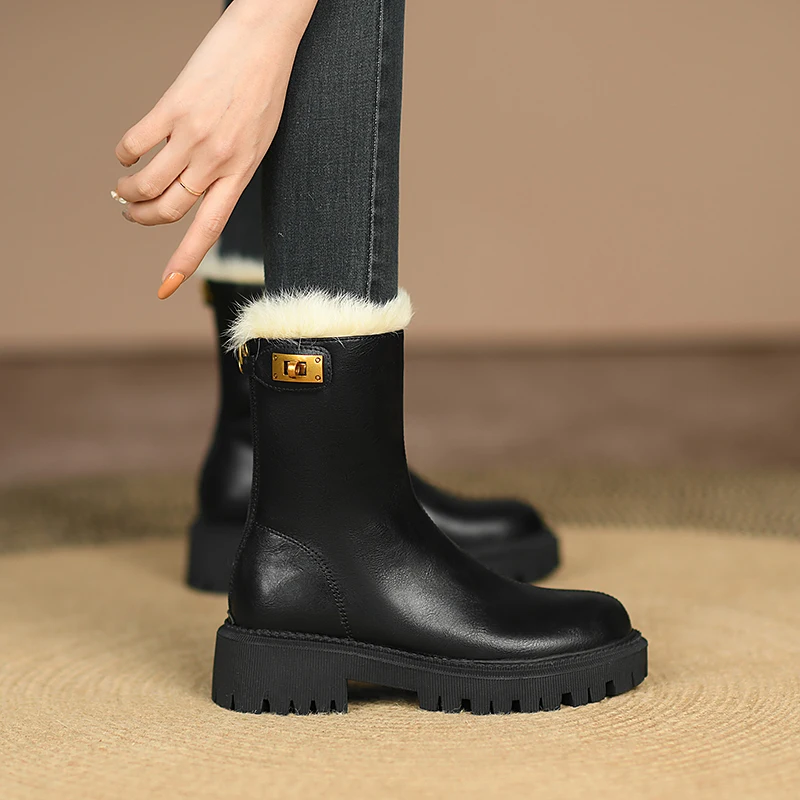 Introducing Rafaela Women's Snow Boots by Footens Shoes the perfect combination of fashion and functionality. Made with split leather shaft and upper material. these boots provide durability and warmth during winter/autumn. The wool insole and lining ensure comfort. while the rubber outsole and hoof heels offer traction and style. These British-style boots also feature a zipper closure for convenience. Get yours today- fits true to size.