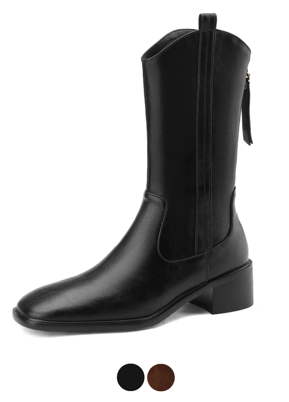 Footens Shoes Presents the Renny Women's Mid Calf Boots. featuring a genuine cow leather upper and shaft for durability and style. The rubber outsole provides traction. while the short plush lining and insole offer warmth and comfort. With a fashionable square heel and zip closure. these boots are perfect for winter and autumn.