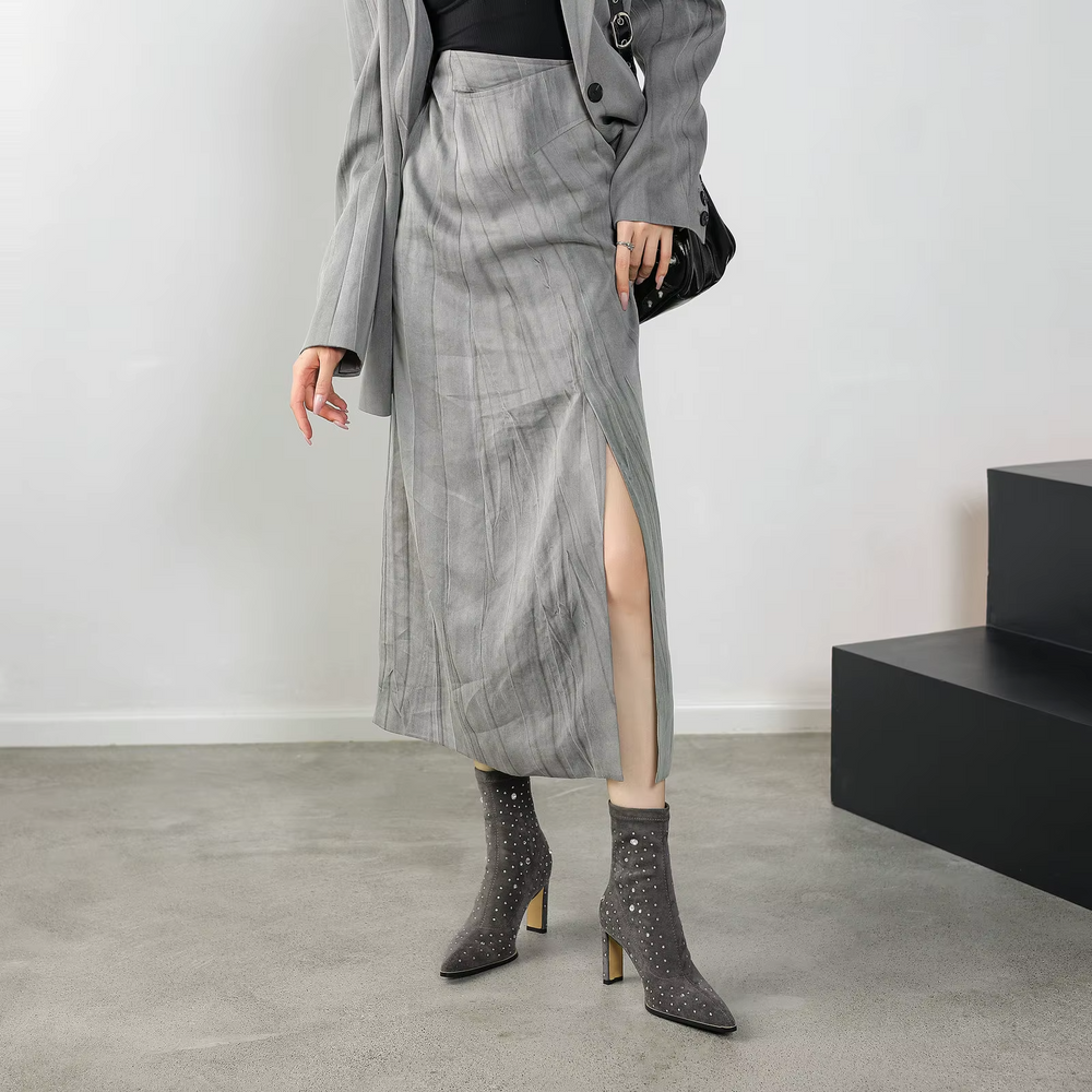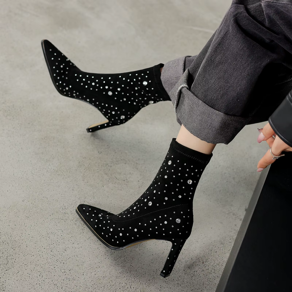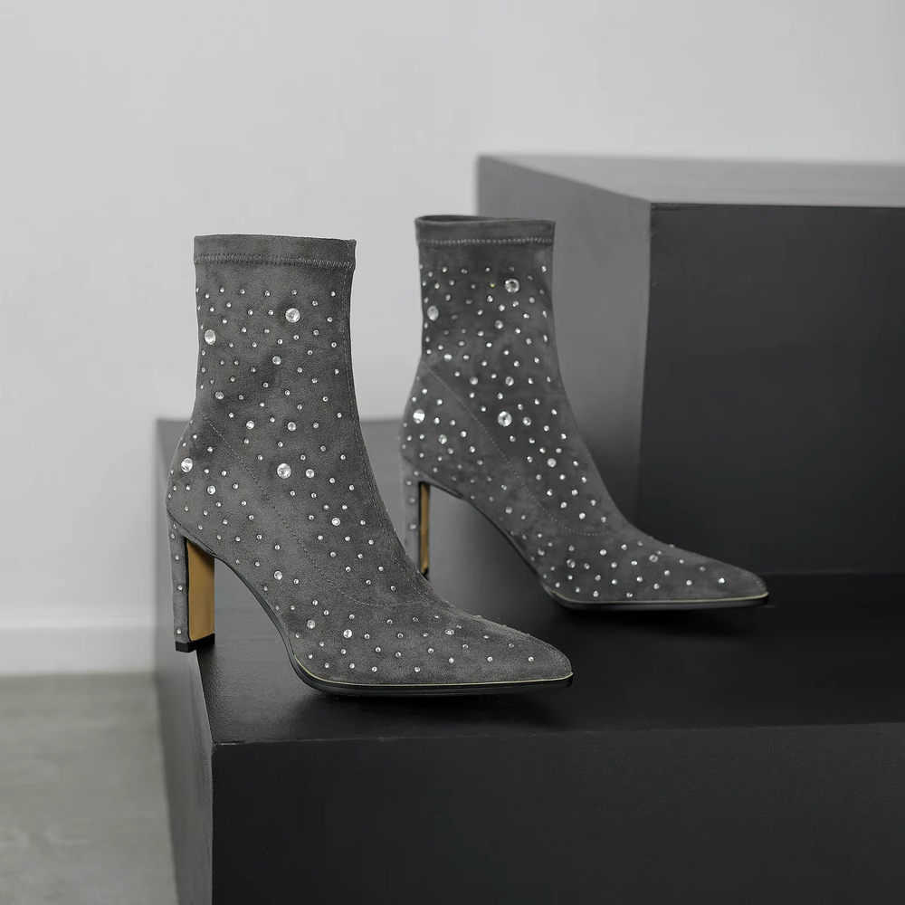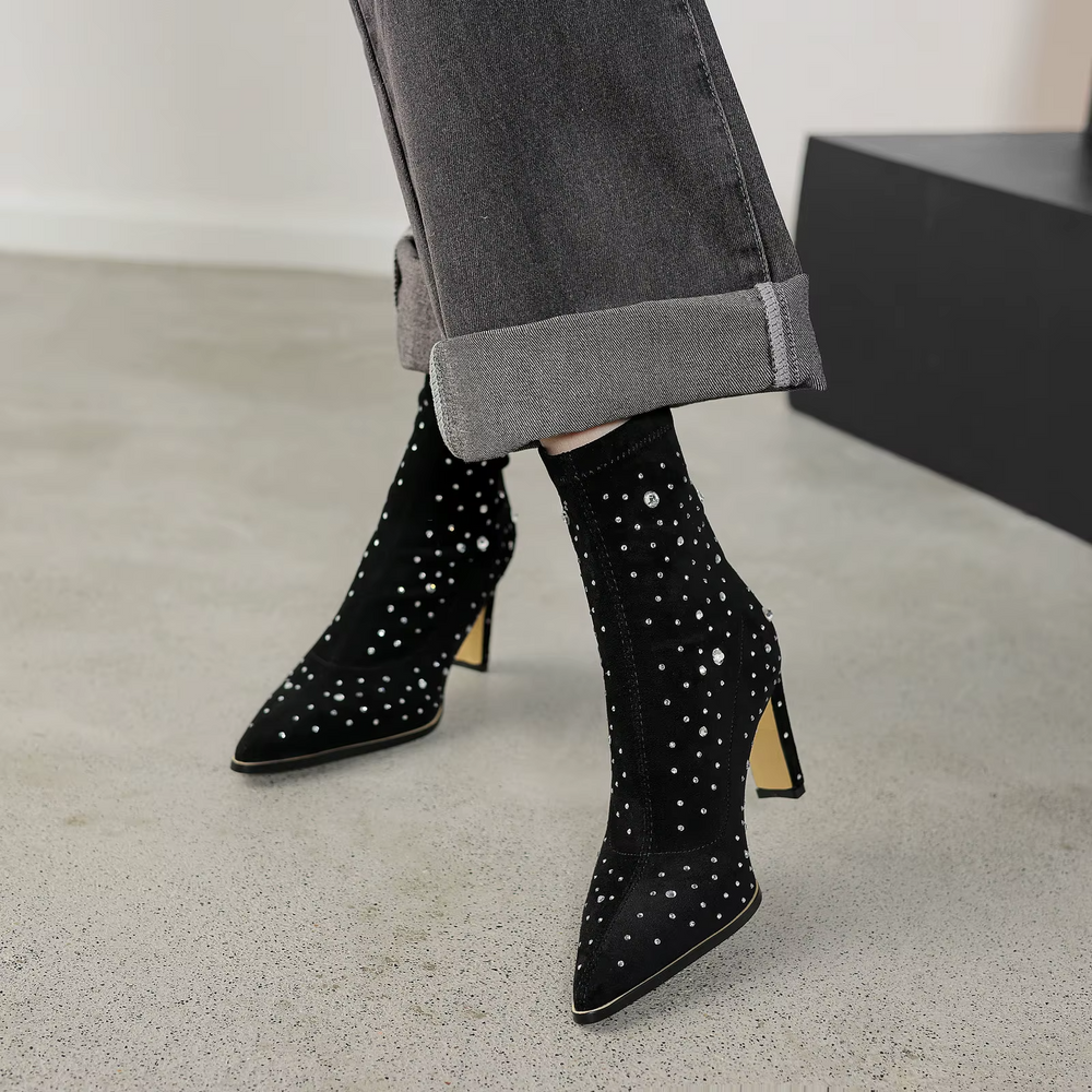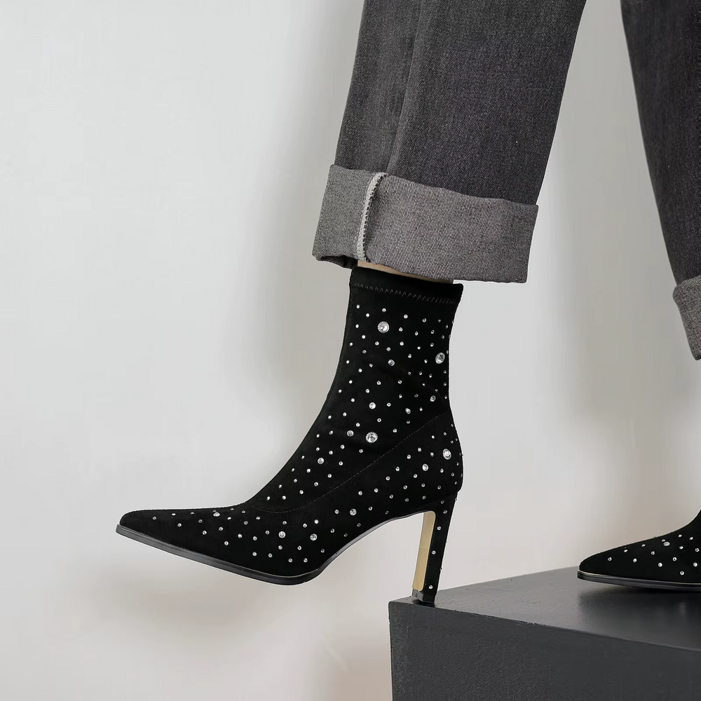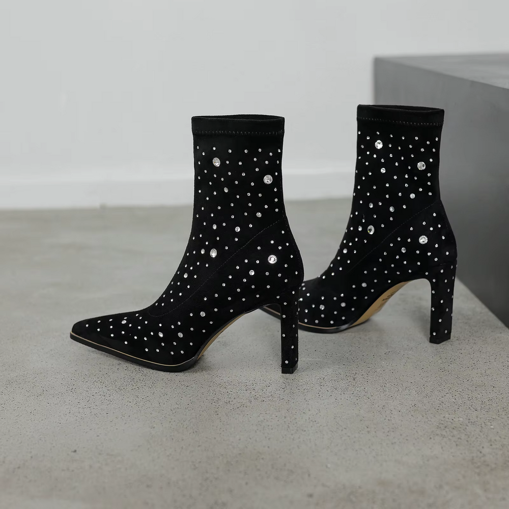 The Rosaura Ankle Boots exude modern elegance with its stretch fabric upper and innovative slip-on closure. The plush suede lining and pigskin insole provide luxurious comfort. while the rubber outsole and wedge heel offer style and stability. Perfect for the winter and autumn seasons. these boots feature a pointed toe and platform design for a touch of sophistication. Elevate your style with Footens Shoes Rosaura Women's Rhinestones Stretch Ankle Boots.