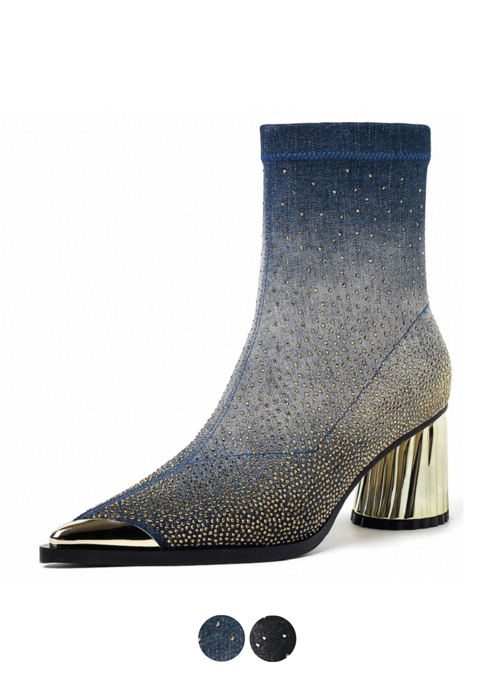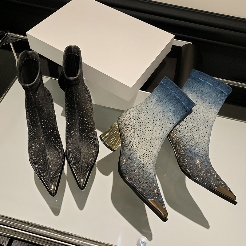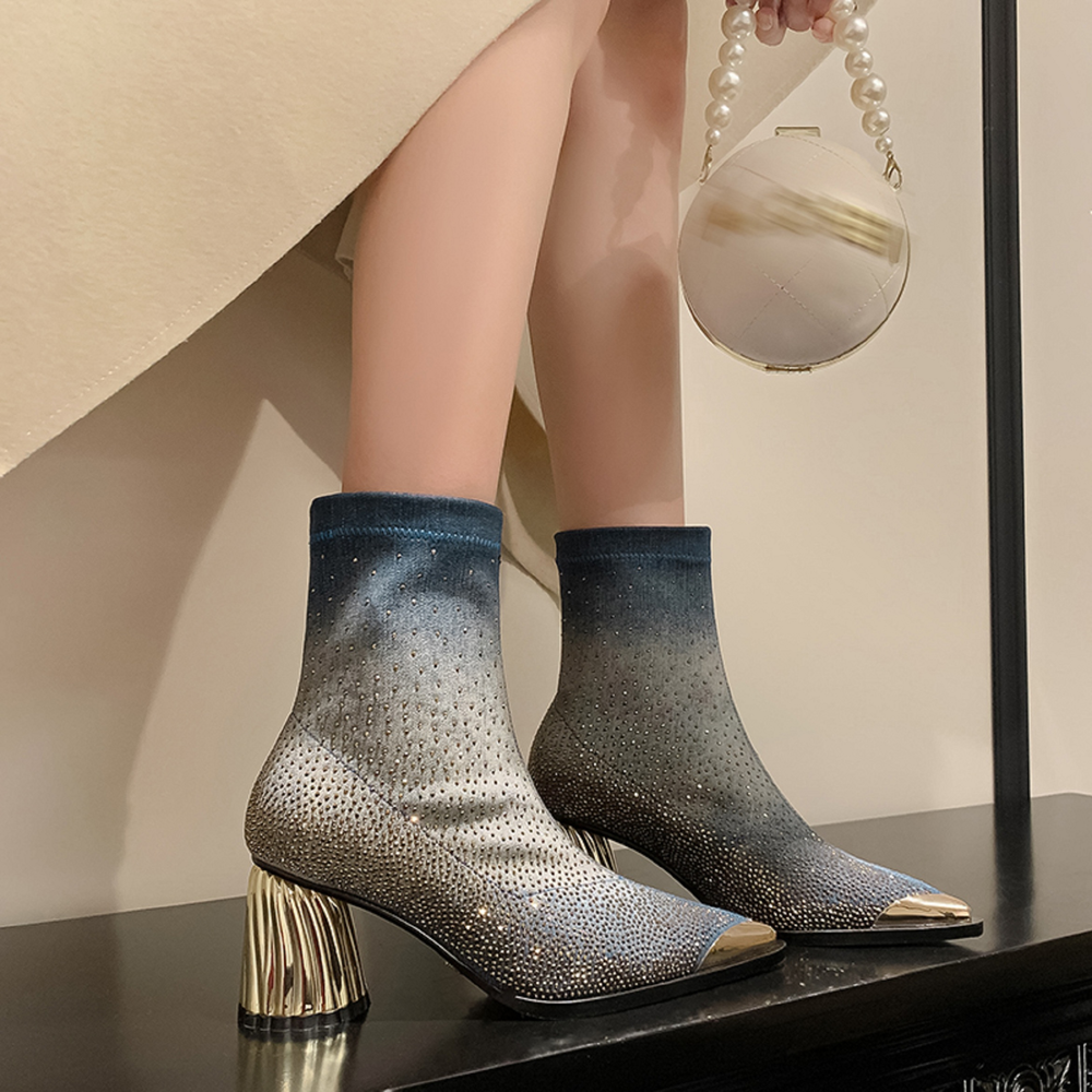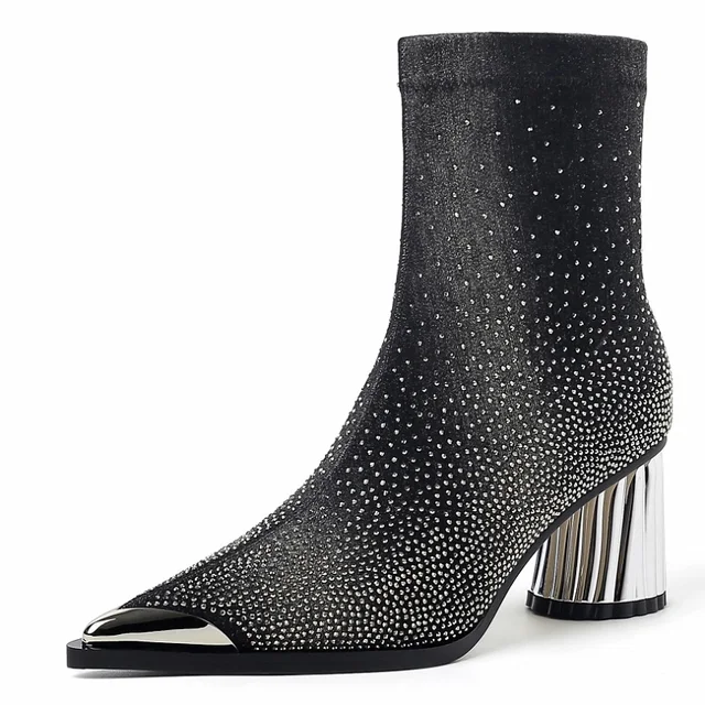 Elevate your shoe game with Showly Women's Pointy Toe Boots by Footens Shoes. Designed with a stretch fabric upper and lining. these modern boots provide a comfortable fit. The rubber outsole and EVA insole offer durability and support. while the mid-calf boot height adds a touch of style. These boots are perfect for spring and autumn. featuring a unique heel and luxurious rhinestone detailing.