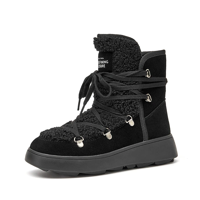 The Mariana women's boots from Footens Shoes are designed with the winter and autumn elements in mind. Crafted with a round toe shape. fur shaft. mixed colors. and lace-up closure. these ankle-height snow boots are both fashionable and functional. The rubber outsole. plush lining. and plush insole ensure durability and comfort for all-day wear. True to size.